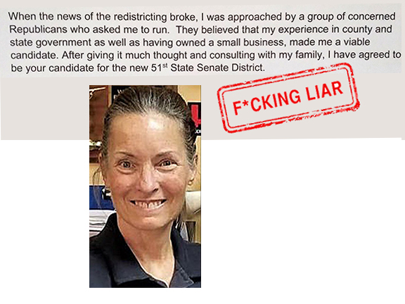 “When the news of the redistricting broke, I was approached by a group of concerned Republicans who asked me to run. They believed that my experience in county and state government as well as having owned a small business, made me a viable candidate. After giving it much thought and consulting with my family, I have agreed to be your candidate for the new 51st State Senate District.”