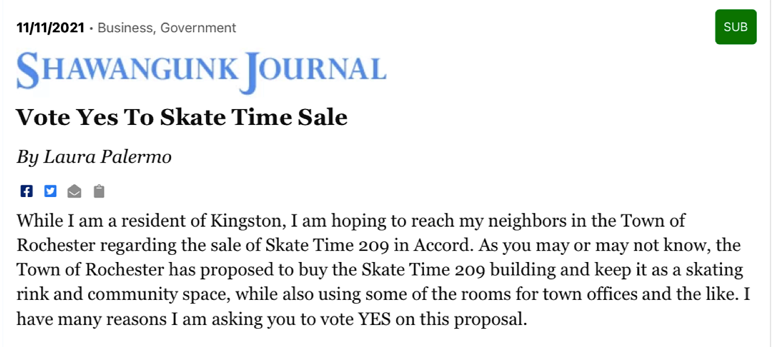 Laura Palermo is a resident of Kingston, but that does not curb her effort to influence a vote in the Town of Rochester, and here are her ridiculous reasons for writing the article: